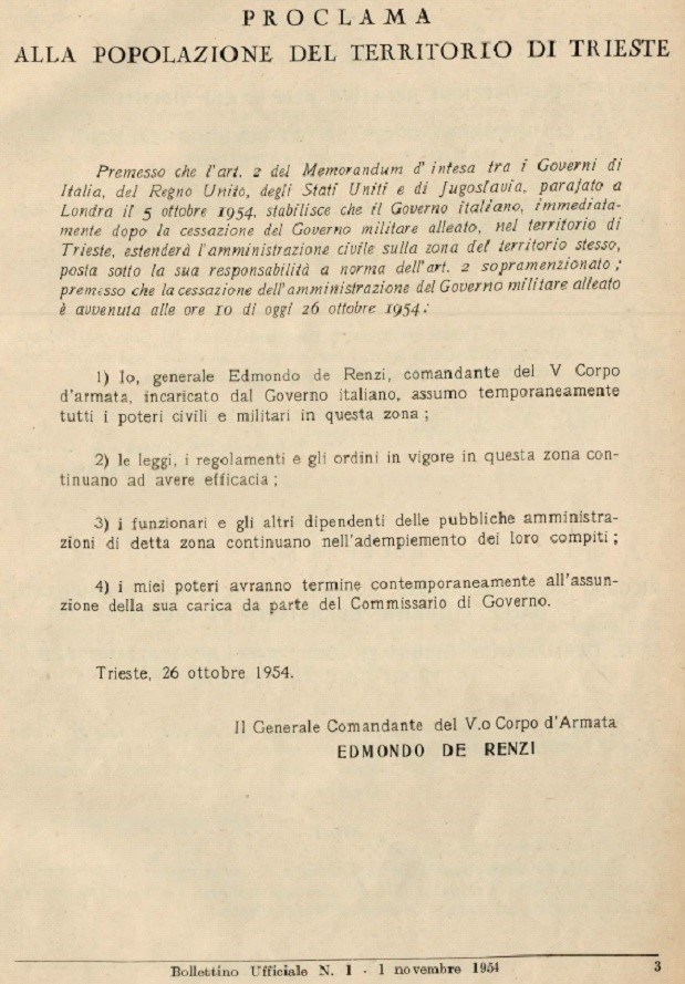 Ecco il Proclama che sancisce l’ inizio dell’ Amministrazione Civile Provvisoria della Zona A del TLT da parte del governo italiano (non dello Stato). Il primo ad assumere l’ incarico fu il generale Edmondo de Renzi il quale passò l’ incarico il giorno seguente al primo Commissario di Governo dott. Palamara.